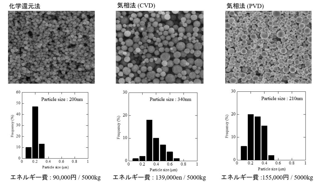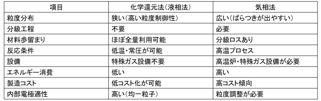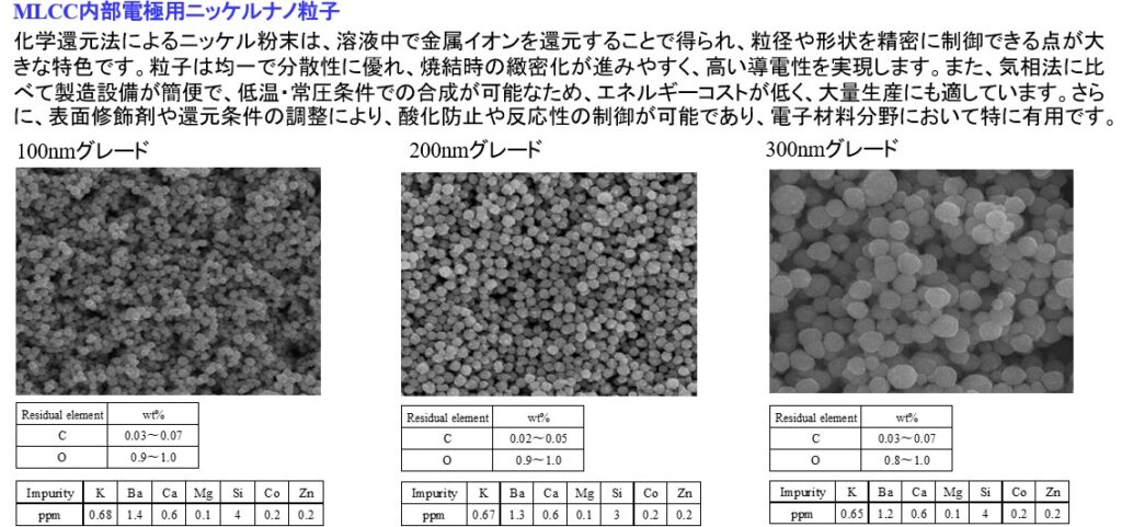 化学還元法(液相法)によるニッケル(Ni)粒子の製造は、従来の気相法と比較して、粒度制御性とコスト効率の両面で優れた特長を有しています。液相法では、反応条件を精密に制御することで粒度分布の狭い均一なNi粒子を得ることができ、分級工程を必要としません。そのため、生成した粒子を無駄なく内部電極材料として活用できます。また、高温炉や特殊ガス設備を必要とする気相法とは異なり、液相法は比較的低温・常圧で反応が可能であるため、エネルギー消費を大幅に抑えることができます。これにより、設備投資および製造コストの低減を実現します。当社の化学還元技術は、高品質・高歩留まり・低コストを同時に実現する、次世代ニッケル粒子製造プロセスです。